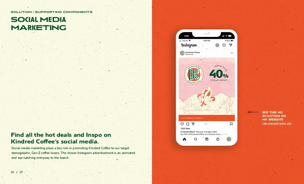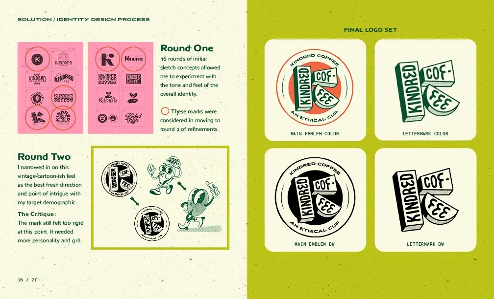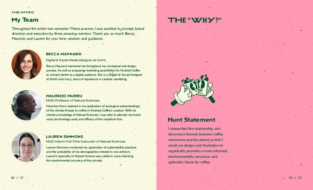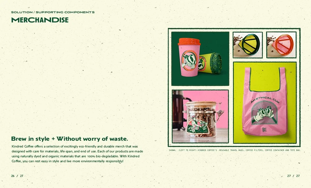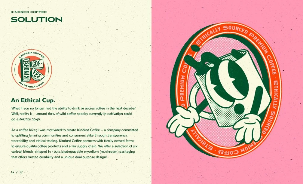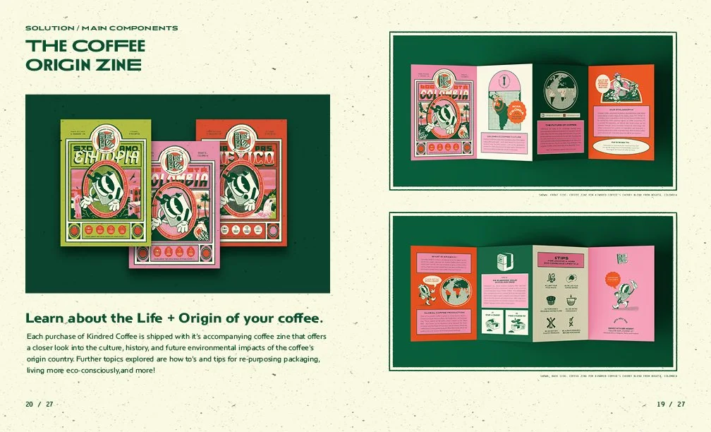 My competitive research, demographic survey, and mentor advice informed the first round of logo design concepts. In five rounds, starting with 50 thumbnail sketches, I narrowed down the look and feel of the brand through peer critique and eliminated ones that didn’t resonate with my target audience. After countless tweakments the final logo was chosen and informed the rest of my brand’s unique visual identity. Inspired by retro character design and bold color palettes that reference the vibrant colors of the Amazonian Rainforest. After finalizing the mycelium packaging, coffee origins zine, website, social media pages, and merchandise; Kindred Coffee is ready to be seen!